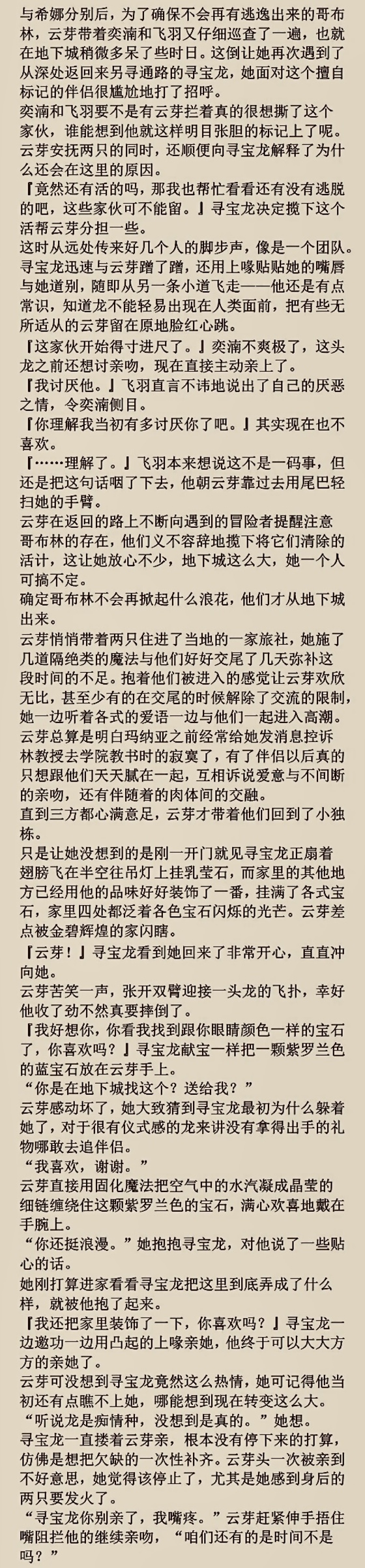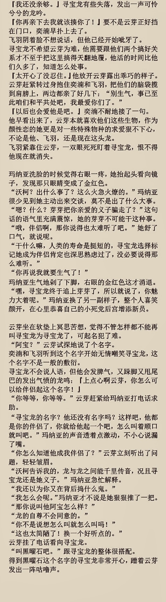对云芽:奕湳(沉迷),飞羽(迷恋得离不开),黑曜石(欢欣雀跃的喜欢)。对奕湳、飞羽、黑曜石:云芽(爱)(爱)(……大概喜欢)。